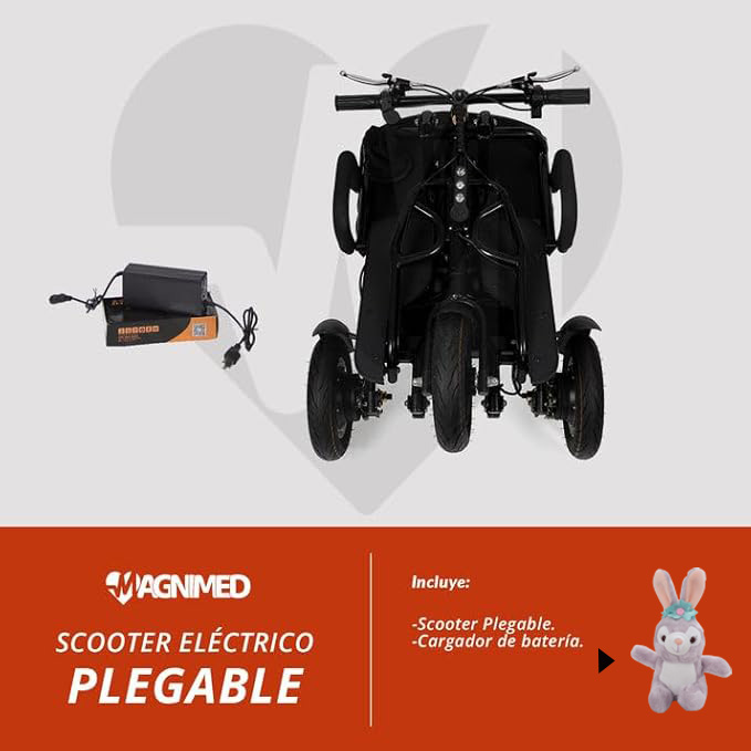 Scooter a baterías plegable y de gran potencia, único modelo que se puede transportar fácilmente en su auto, al ser plegable cabe perfectamente en la maleta del vehículo.
