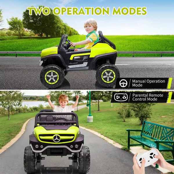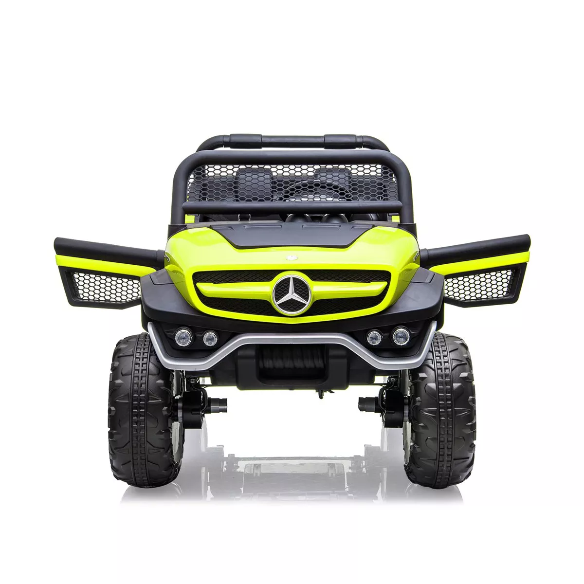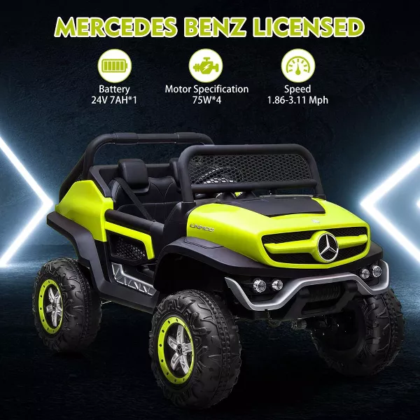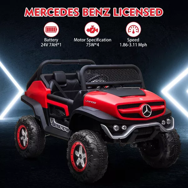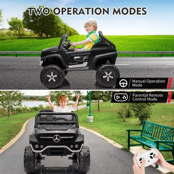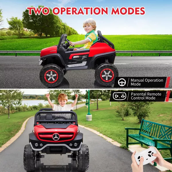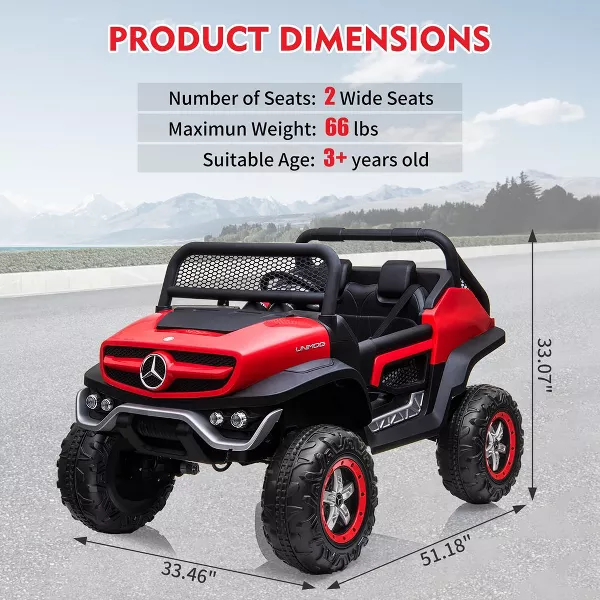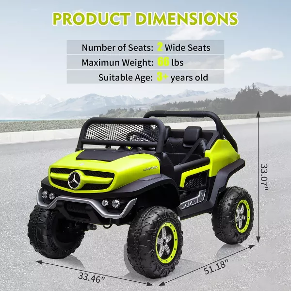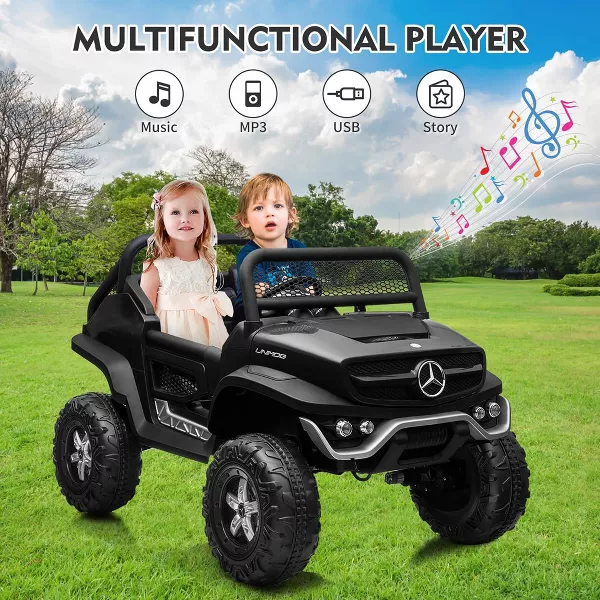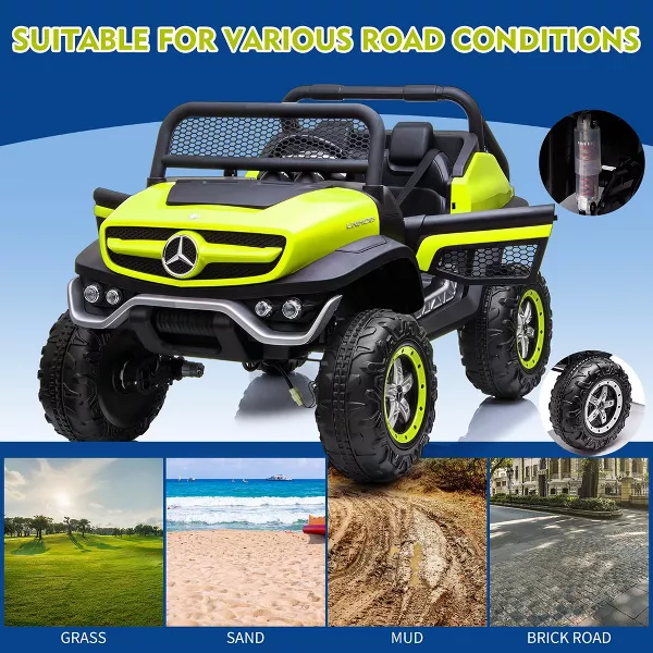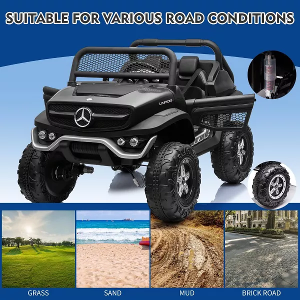 - Licensed Mercedes Benz: The ride-on toy is equipped with battery level display, LED headlights, taillights, wear-resistant tires, multi-function dashboard, real pedal response, adjustable seatbelt, lockable doors, and grid windshield for off-road style, give your child the most realistic driving experience. While the USB port and TF card slot enable connectivity with devices to play music and stories to entertain and educate children, making their driving trip more enjoyable and entertaining.