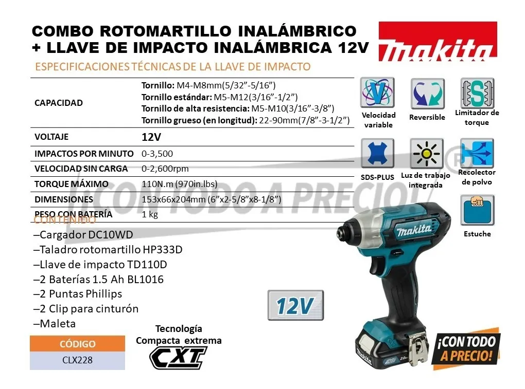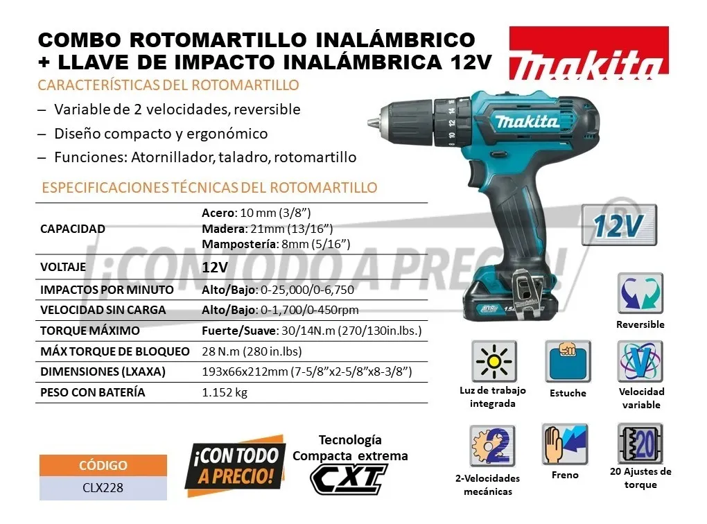 COMBO ROTOMARTILLO INALÁMBRICO + LLAVE DE IMPACTO INALÁMBRICA 12V