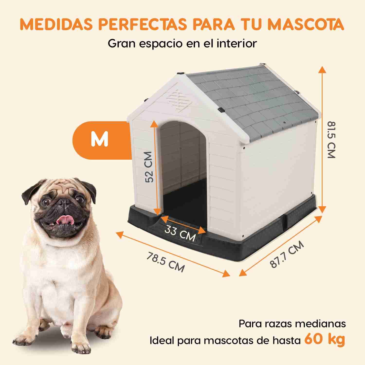 Casa para perros fabricada en plástico ABS 100% de alta calidad, que ofrece una construcción sólida, duradera y resistente a la intemperie, corrosión y rayos UV, otorgando protección y uso prolongado. Su diseño sellado, con piso elevado y techo inclinado, brinda un refugio cómodo y seguro, protegiendo a tu mascota de la humedad y otros elementos climáticos. Ideal para interiores y exteriores, cuenta con rejillas de ventilación que permiten una circulación constante de aire fresco, manteniendo a tu perro fresco en verano y cálido en invierno gracias a sus propiedades térmicas. Además, incluye un panel lateral que se abre en forma de porche, proporcionando espacio adicional y mejor ventilación. La casa puede montarse con la puerta plegable en el lado derecho o izquierdo, adaptándose a tus necesidades. Fácil de armar sin herramientas, está diseñado para perros medianos y grandes, soportando hasta 60 kg. Sus dimensiones son 87,7 x 78,5 x 81,5 cm, con una puerta de 52,5 x 33 cm y un peso neto de 9,75 kg. Peso Bruto caja individual: 11.45 kg Medidas de la caja individual: 86.5 X 15 X 79.5 CM