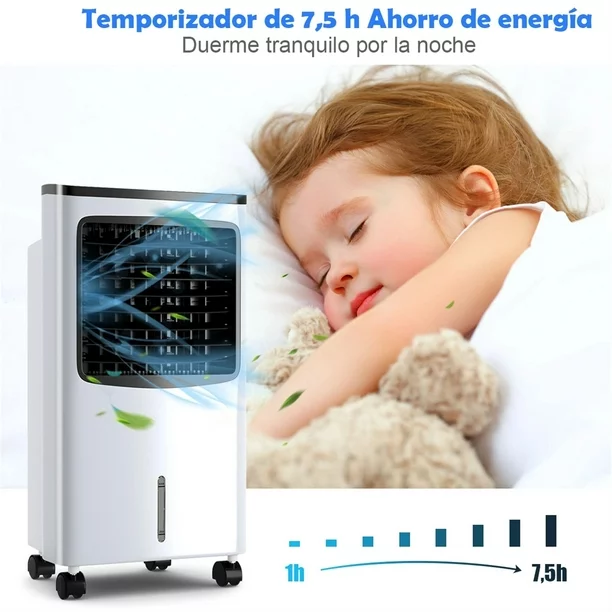 Se puede utilizar como acondicionador, humidificador, ventilador y purificador del aire, 3 modalidades (normal/natural/sueño) y 3 velocidades (baja/mediana/alta), Almohadilla apanalada para un mejor enfriamiento, Filtro para bloquear polvo, bacterias y partículas para tener un aire más limpio, La neblina aumenta la humedad del aire, la purifica y mantiene la piel hidratada, Tanque del agua de 8 l y 2 cajones para el hielo (incluido) para un mayor enfriamiento, Potencia 75 W y temporizador de 7,5 horas para ahorrar energía, Con mando para programarlo también desde la cama o desde el sofá, Tanque del agua desmontable para llenarlo y limpiarlo, Función oscilación automática para un mejor enfriamiento, La ventana te ayuda a controlar el nivel del agua, Con 4 ruedas y empuñadura para desplazarlo fácilmente, La luz de la pantalla se puede apagar en modalidad sueño, Ideal para climas cálidos y secos y para espacios donde la humedad del aire es baja